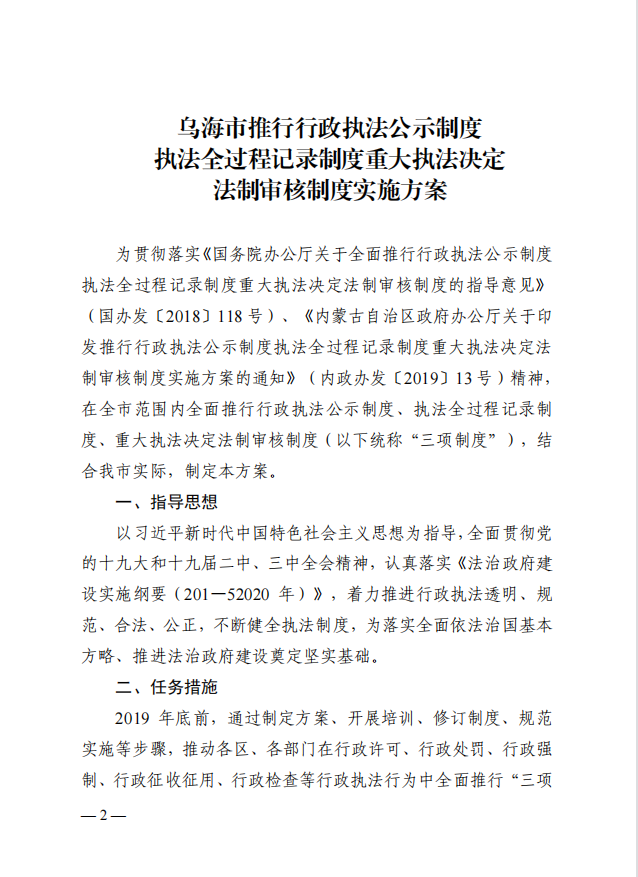 | 標???????題 | 烏海市人民政府辦公室 關于印發《烏海市推行行政執法公示制度執 法全過程記錄制度重大執法決定法制審核制度 實施方案》的通知 | ||||||||