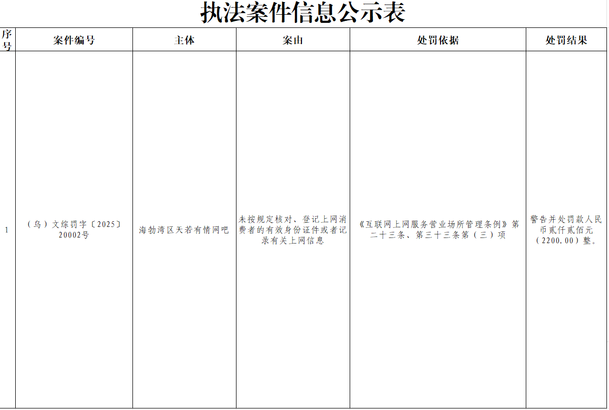 | 索??引??號(hào) | 11150300011556741W/2025-04533 | 發(fā)文字號(hào) | (烏)文綜罰字〔2025〕20002號(hào) | ||||||