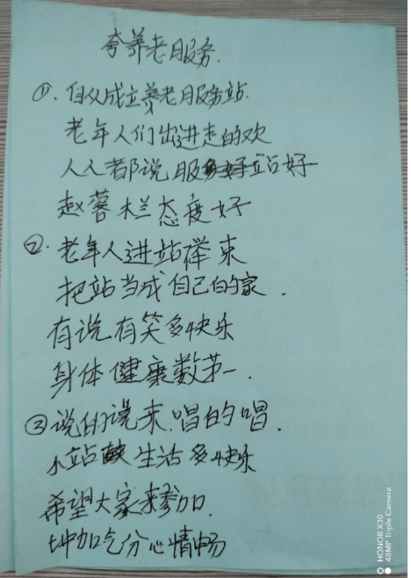 老人在信中稱贊道:“自從成立養老服務站,老年人們進出走得歡,說的說來唱的唱,小站生活多快樂,希望大家來參加,增加氣氛心情暢。。。。。。